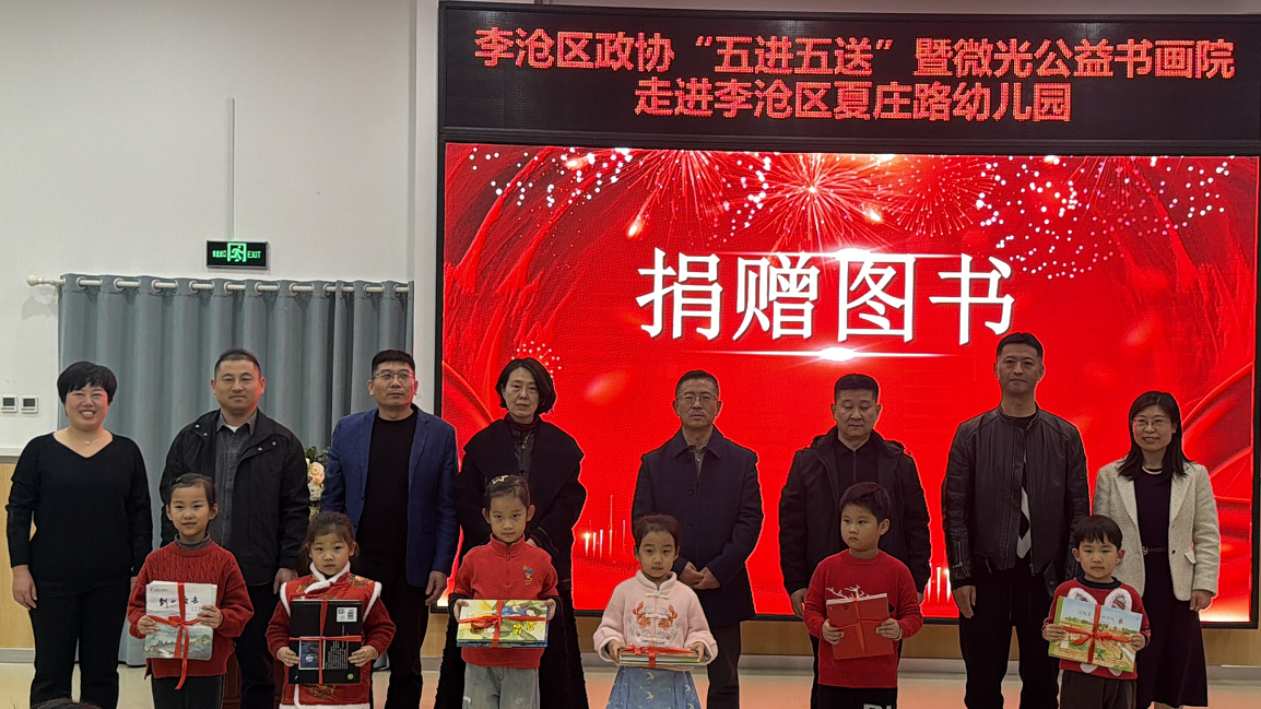 政协委员联合微光公益书画院向幼儿园捐赠了一批涵盖童话、科普、传统文化等内容的图书,政协委员们现场为孩子们分发爱心读物。